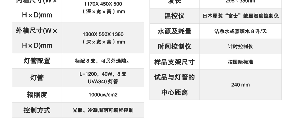 用途:紫外耐氣候試驗(yàn)箱主要用于塑料,涂料、橡膠材料在模擬由太陽(yáng)光,雨水、露水環(huán)境下的人工加速試驗(yàn)