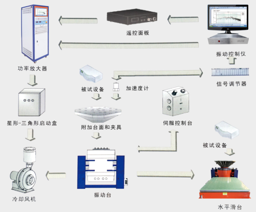 振動臺系統(tǒng)有幾大部分組成功率放大器(簡稱功放)控制儀、振動臺、附加臺面及夾具、制冷單元(有冷卻風(fēng)機(jī)、水冷裝置)、傳感器、水平滑臺。