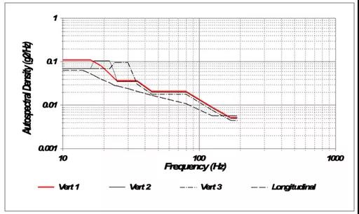 SAE J2380標(biāo)準(zhǔn)振動目標(biāo)譜基于實(shí)際道路測量數(shù)據(jù),旨在模擬行駛10萬英里對電池組和模塊的影響。該標(biāo)準(zhǔn)要求一系列隨機(jī)振動目標(biāo)譜應(yīng)用于三個(gè)垂直軸,試驗(yàn)時(shí)長從9分鐘到38小時(shí)不等。