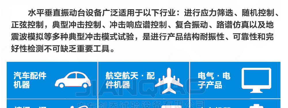 用途:該水平垂直振動(dòng)臺(tái)可模擬再現(xiàn)正弦、隨機(jī)、諧振搜尋與駐留、典型沖擊和道路仿真等模式,符合:(MIL-STD,DIN,ISO,ASTM,IEC,ISTA,GB,GJB,JIS,BS等國(guó)家及國(guó)際測(cè)試標(biāo)準(zhǔn))
