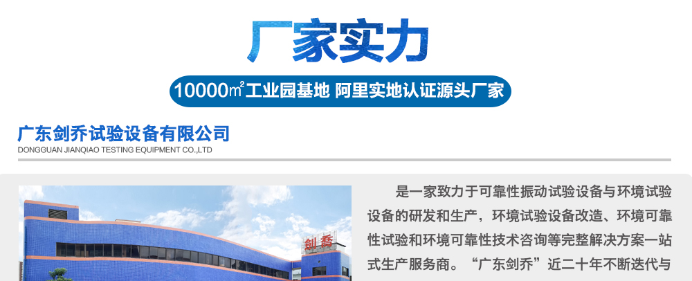 您好!歡迎光臨廣東劍喬試驗(yàn)設(shè)備有限公司!主營(yíng)產(chǎn)品:振動(dòng)臺(tái)、振動(dòng)試驗(yàn)臺(tái)、高頻振動(dòng)臺(tái)、振動(dòng)試驗(yàn)機(jī)、沖擊試驗(yàn)臺(tái)、三綜合環(huán)境試驗(yàn)箱、冷熱沖擊試驗(yàn)箱等設(shè)備!