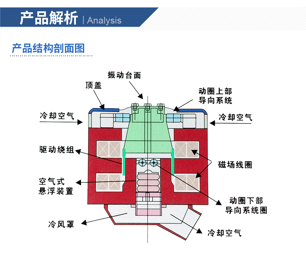 性能特點(diǎn):●強(qiáng)制風(fēng)冷 ●正弦激振力范圍: 1kN ~ 70kN●兩倍的正弦沖擊力(2噸以上可選三倍) ●輕質(zhì)動(dòng)圈,優(yōu)化設(shè)計(jì),耐振性能強(qiáng)●中心氣囊承載能力強(qiáng),低頻性能好 ●可配置水平滑臺(tái)●風(fēng)機(jī)冷卻效果好,噪音低 ●使用頻率可從1Hz開始●隨機(jī)與正弦激振力1:1 ●位移峰峰值最大可達(dá)100mm●耳軸氣囊隔震效果好 ●雙磁路設(shè)計(jì),漏磁低,磁場(chǎng)均勻●正弦、隨機(jī)、沖擊等試驗(yàn)功能 ●高效率、高可靠性功率放大器系統(tǒng)特點(diǎn):◎一階共振頻率高、使用頻率寬優(yōu)化的動(dòng)圈骨架結(jié)構(gòu)設(shè)計(jì),特別是對(duì)傳統(tǒng)結(jié)構(gòu)的動(dòng)圈骨架傳力角板等薄弱環(huán)節(jié)進(jìn)行增強(qiáng)設(shè)計(jì),有效提高了傳力剛度;采用膠接與螺釘連接的復(fù)合固定繞線環(huán)筒和繞線環(huán)筒增強(qiáng)膠孔的新結(jié)構(gòu),增強(qiáng)了繞組的剛度。顯著提高了動(dòng)圈的一階共振動(dòng)頻率,超過了國際同類產(chǎn)品。◎動(dòng)圈繞組可靠性高獨(dú)創(chuàng)的動(dòng)圈繞組加強(qiáng)環(huán)的新結(jié)構(gòu)和新工藝,顯著提高了動(dòng)圈繞組工作在大推力、高加速度振動(dòng)、沖擊和高溫環(huán)境中的耐振可靠性。◎風(fēng)冷效率高創(chuàng)新的電動(dòng)臺(tái)冷卻風(fēng)道設(shè)計(jì):改進(jìn)了進(jìn)風(fēng)結(jié)構(gòu),上磁環(huán)用長槽型進(jìn)風(fēng)道取代圓孔型進(jìn)風(fēng)道;勵(lì)磁線圈采用蜂窩式風(fēng)道、中磁環(huán)采用雙層風(fēng)流式風(fēng)道、下磁環(huán)采用斜楔型風(fēng)道等新結(jié)構(gòu),顯著提高了冷卻效果。◎冷卻風(fēng)機(jī)冷卻風(fēng)機(jī)具有獨(dú)特的風(fēng)道等結(jié)構(gòu)設(shè)計(jì),風(fēng)機(jī)冷卻效果好,噪音低。◎水平和垂直試驗(yàn)帶水平滑臺(tái)的電動(dòng)振動(dòng)臺(tái)可以用于水平和垂直試驗(yàn),兩個(gè)方向的切換方式簡(jiǎn)單,翻轉(zhuǎn)方便。◎采用IGBT模塊功放采用性能可靠的MOSFET和IGBT模塊,具有很高的穩(wěn)定性和可靠性。◎安全性能產(chǎn)品符合歐洲標(biāo)準(zhǔn)測(cè)試要求,在功放上裝有緊急停止開關(guān),有效應(yīng)對(duì)突發(fā)事件。符合美國UL和CE安全要求。